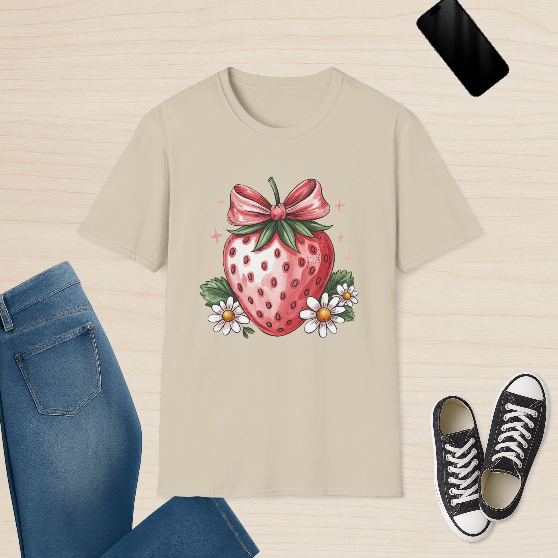 Verschönern Sie Ihre Garderobe mit unserem Strawberry and Flowers Pink Coquette Bow T-Shirt – die perfekte Mischung aus verspieltem Charme und Vintage-Stil. Dieses weiche, weiße Unisex-T-Shirt zeigt eine wunderschön illustrierte Erdbeere mit einer rosa Schleife, umrahmt von zarten Gänseblümchen und frischen grünen Blättern. Mit seiner sanften, koketten Ästhetik ist es perfekt für alle, die Cottagecore, Soft-Girl-Vibes oder ausgefallene Mode lieben.